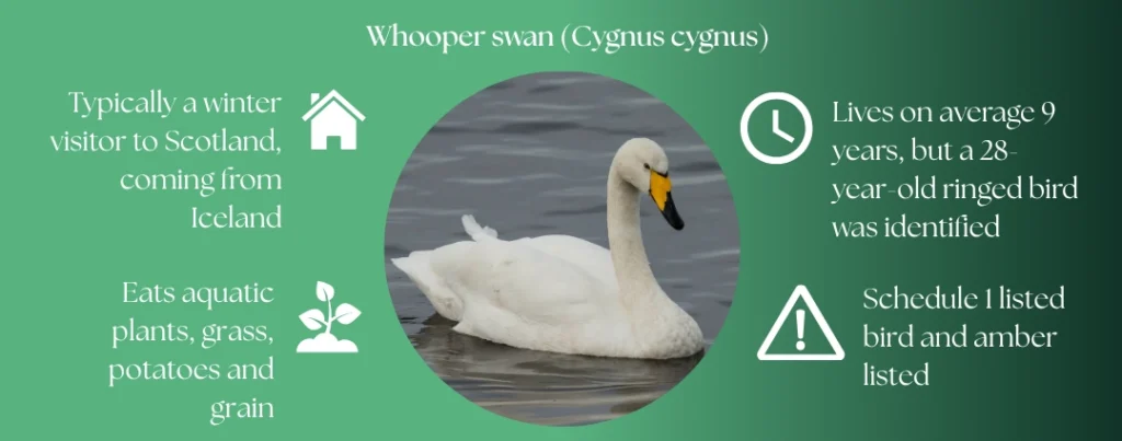 Initially, EP Ecology was commissioned to conduct a Preliminary Ecological Appraisal (PEA) that would support a planning application for a proposed 40MW solar farm in Renfrewshire. The site was mostly farmland, with mature trees and hedges along the boundaries of fields. The site was identified as being near to a Special Protection Area (SPA) where there were whooper swans. Whooper swans are winter visitors to Scotland, coming from Iceland in search of food. They are a Schedule 1 listed bird, meaning it is illegal to disturb them. As a PEA does not include in-depth bird surveys, we were subsequently commissioned to carry out detailed winter bird surveys for this species.